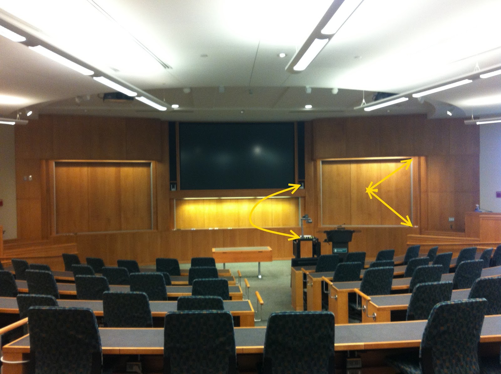 The arrows in the middle point out both a state of the art projector and a state of the art camera. To the right, you can see the different angles to the center of where a slide would be shown. A perfect design in my mind.